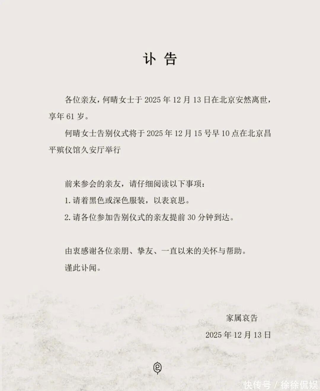 消息来得很突然。一份家属发出的讣告,上面写着何晴在北京安然离世,享岁,告别仪式定在两天后,很多人看到这消息的第一反应是不敢相信,那个在电视里笑了几十年的美人,怎么说走就走了。紧接着是铺天盖地的怀念。电影博主余泳在社交平台上发了一张何晴的黑白照片,照片里的她,还是那么温婉地笑着,他配了一行字:“天堂没有病痛,何晴,大美女,一路走好,”这话说出了很多人的心声,圈内不少人也转发了,大家都在用自己的方式告别。你知道吗,何晴有一个纪录。这个纪录到今天都没人打破,她是中国唯一一位,把四大名著电视剧全部演了一遍的女演员,光是听这个头衔,你就知道她有多特别。